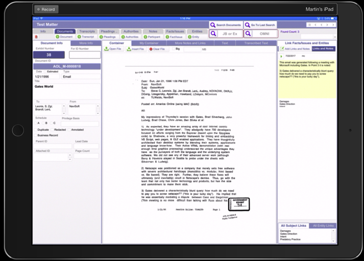 We have leveraged the FileMaker Platform to create the Litigation ToolKit iPad app. What's really exciting about this is that you can now access the ToolKit from the hosted server using this app. All your case documents, your analysis and your team's analysis is accessible in real time from your ipad. No need to more files or worry about synching up versions. Accessible from anywhere that you have an internet connection, or, even go stand alone.